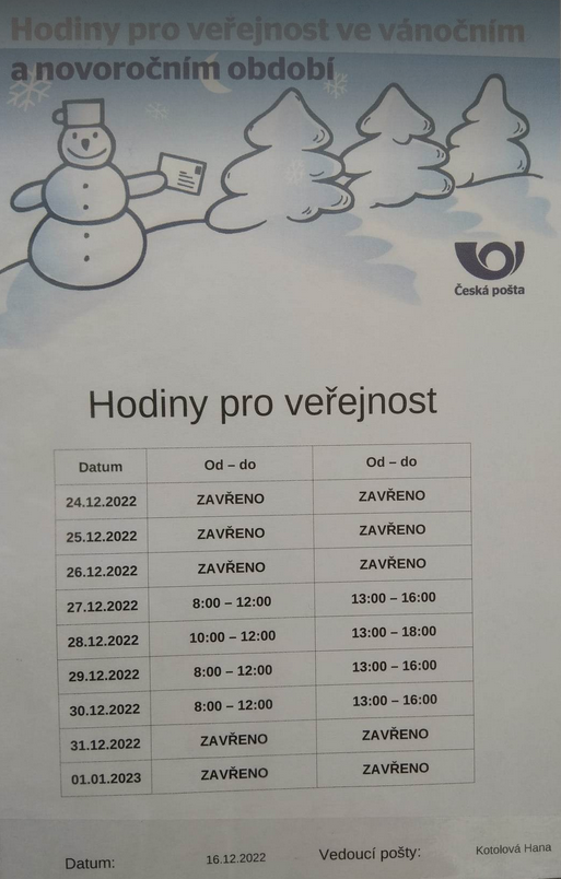 24.-26.12, 31.12. ZAVŘENO / 27.12. 8-12, 13-16 hod. / 28.12. 10-12, 13-18 hod. / 29.-30.12. 8-12, 13-16 hod.