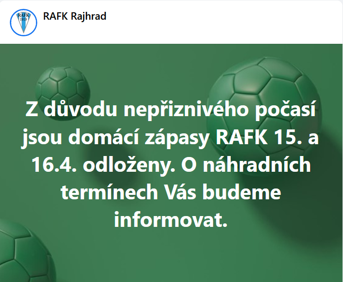 z důvodu nepříznivého počasí jsou všechna domácí utkání RAFK plánovaná na T15/2023 tento víkend odložena