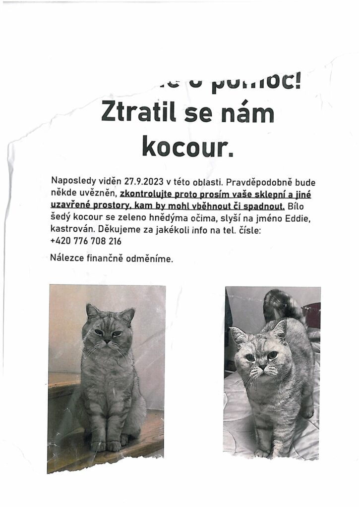 Dne 2.10.2023 byl vhozen do schránky MěÚ Rajhrad leták, kterým hledá majitel ztraceného kocoura