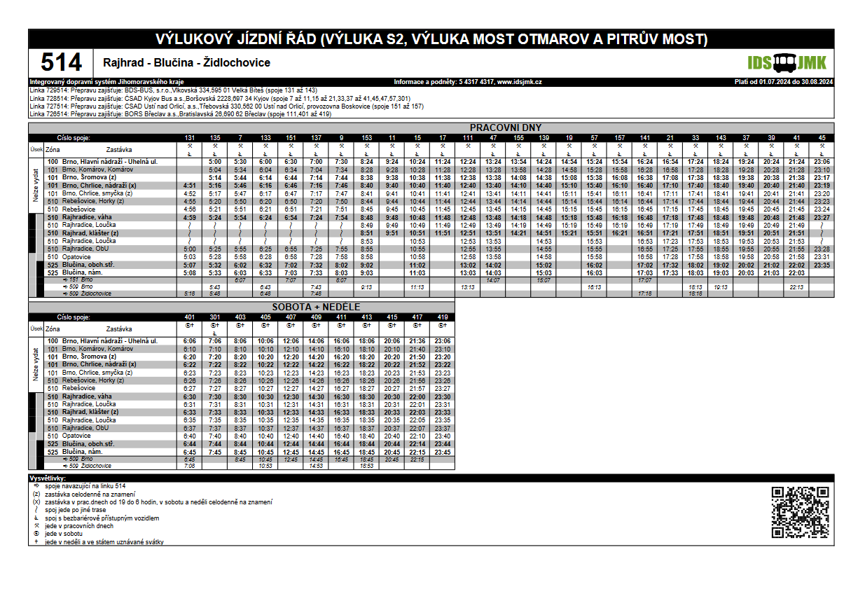 Po dobu rekonstrukce Pitrova mostu v Rajhradě nebude linka 514 zajíždět do centra Rajhradu, ale bude vedena po upravené trase. Výchozí bude z Blučiny, kde naváže na linku 509, pojede po běžné trase přes Opatovice do Rajhradic, odkud budou vybrané spoje zajíždět ke klášteru v Rajhradě, a poté bude pokračovat přes Rebešovice na Chrlice a Brno. Návaznosti v Rajhradě na vlaky tak nebudou realizovány, vůbec sem linka nebude zajíždět, naopak kvůli vlakové výluce Brno – Chrlice bude z Chrlic nasměrována až do centra města Brna.