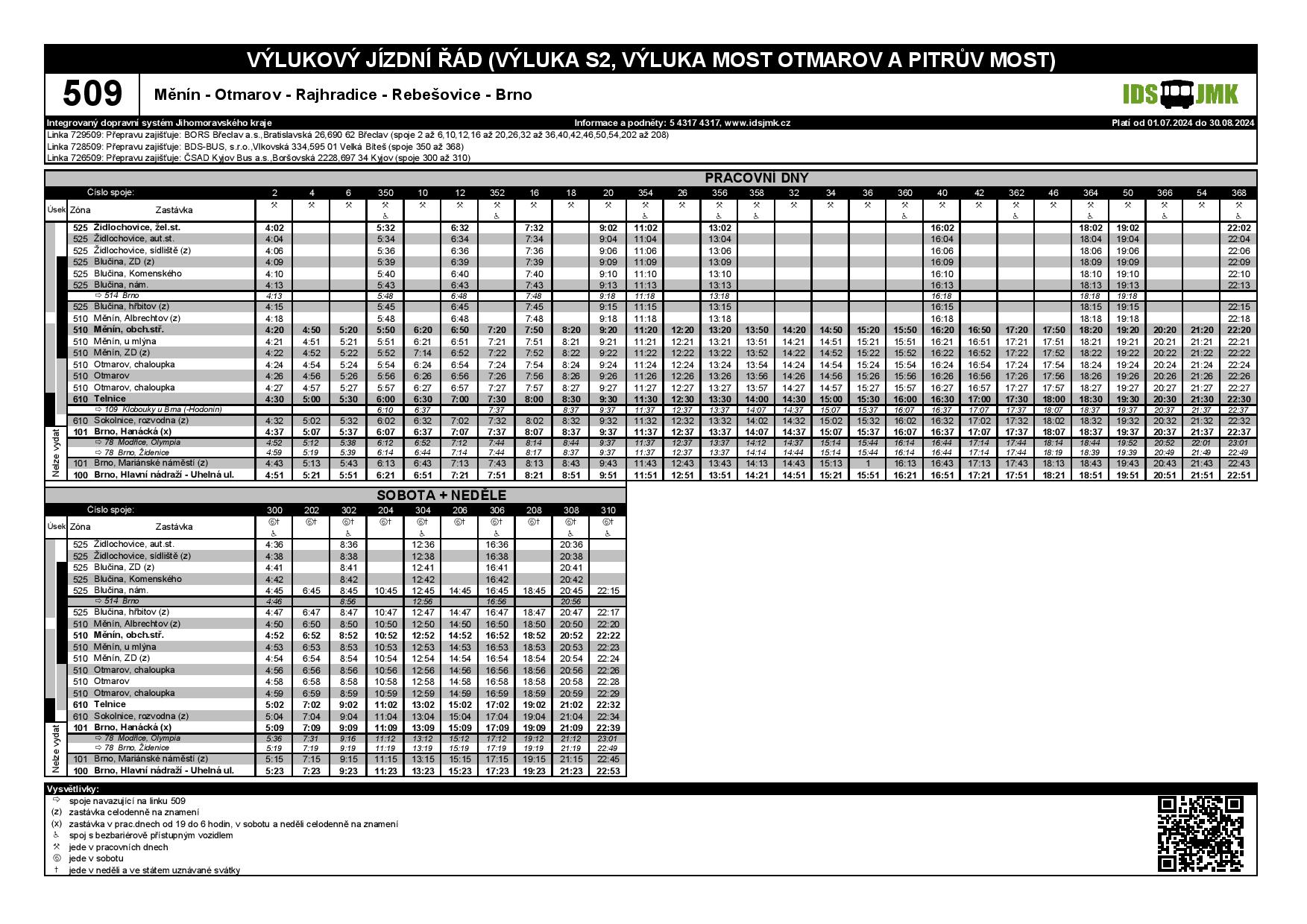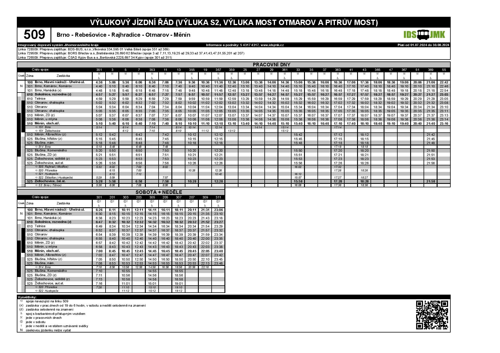 Z důvodu rekonstrukce mostu mezi Otmarovem a Rajhradicemi dojde zároveň k uzpůsobení vazby mezi linkami 509 a 514. Přestup mezi těmito linkami bude probíhat v Blučině. Samotná linka 509 bude protažena až do Židlochovic a po návaznosti v Blučině bude zajišťovat obsluhu Měnína a Otmarova. V Otmarově se bude autobus otáčet v prostoru před hasičskou zbrojnicí a linka bude dále pokračovat na Telnici, Sokolnice a Brno.