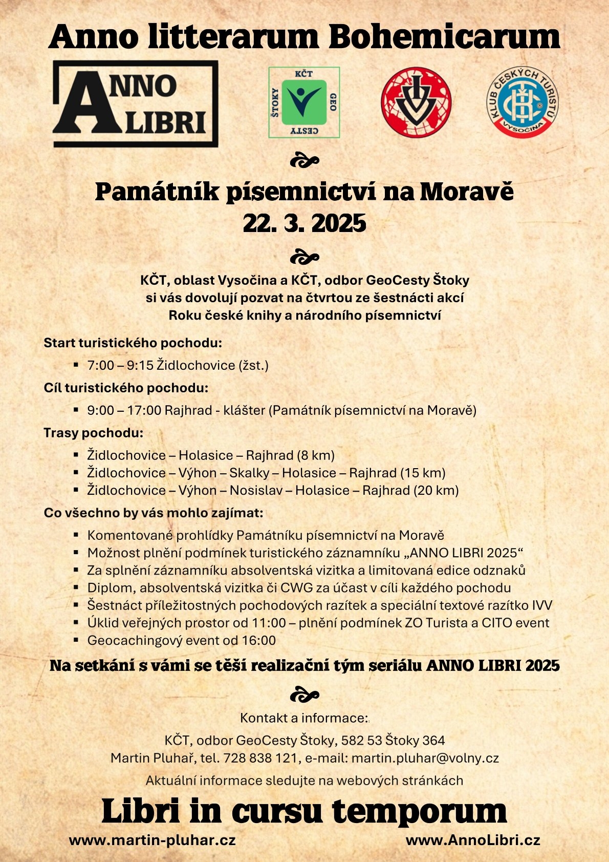 - Klub českých turistů – ANNO-LIBRI – veřejný turistický pochod ze Židlochovic do Památníku písemnitví u příležitosti roku české knihy a národního písemnictví