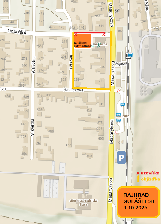 RAJHRAD / 4.10.2025 / GULÁŠFEST a DÝŇODLABÁNÍ / uzavírka části ul. Odbojářů podél areálu sokolovny, přilehlé křižovatky nebudou záměrem dotčeny