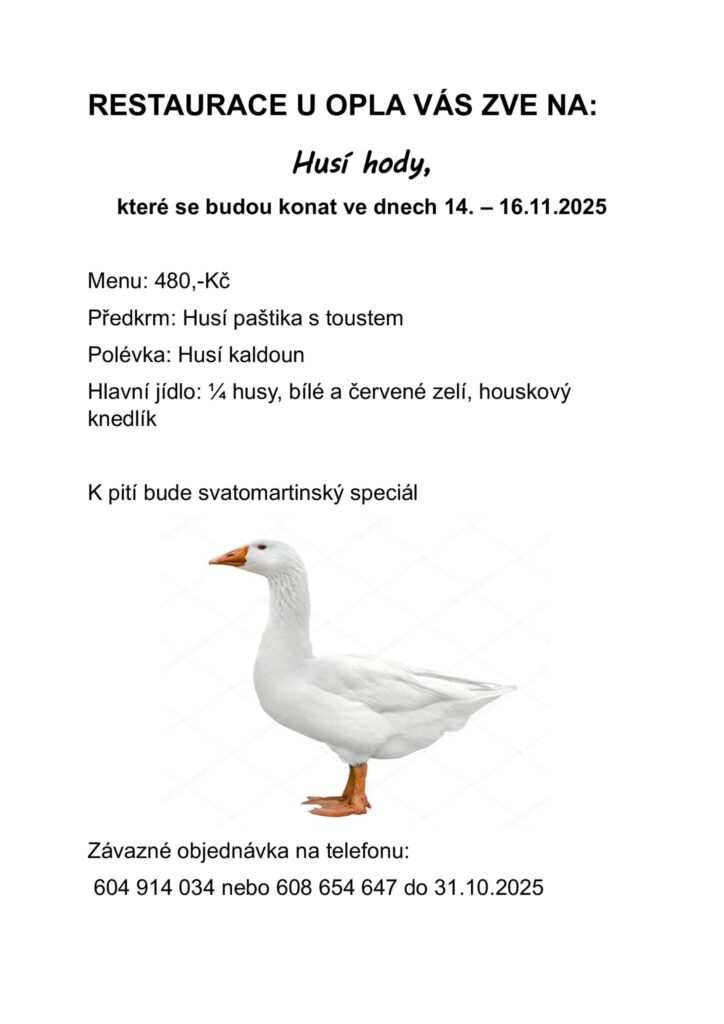- Restaurace u Opla zve na své husí hody v menu restaurace od pátku do neděle 14.-16.11.2025, na objednání