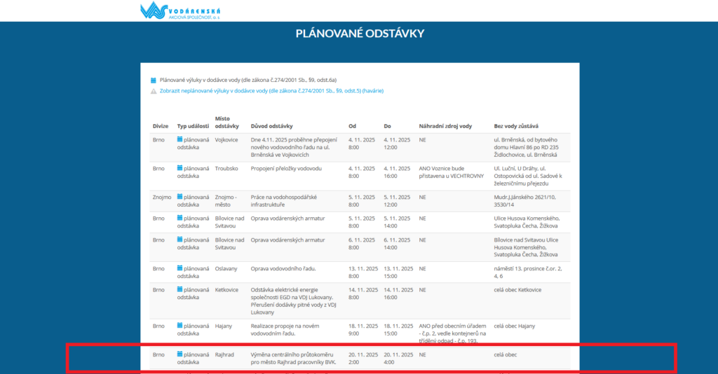 Důvod výluky: Výměna centrálního průtokoměru pro město Rajhrad, provádí pracovníci BVK