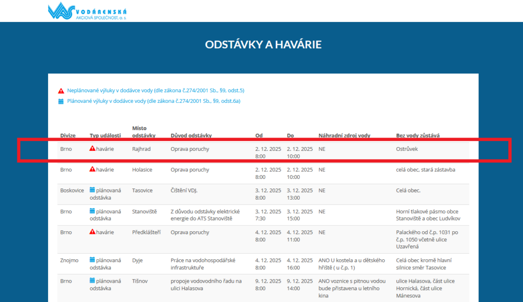 VAS - odstávka vody Ostrůvek 8-10 hod. - 2.12.2025