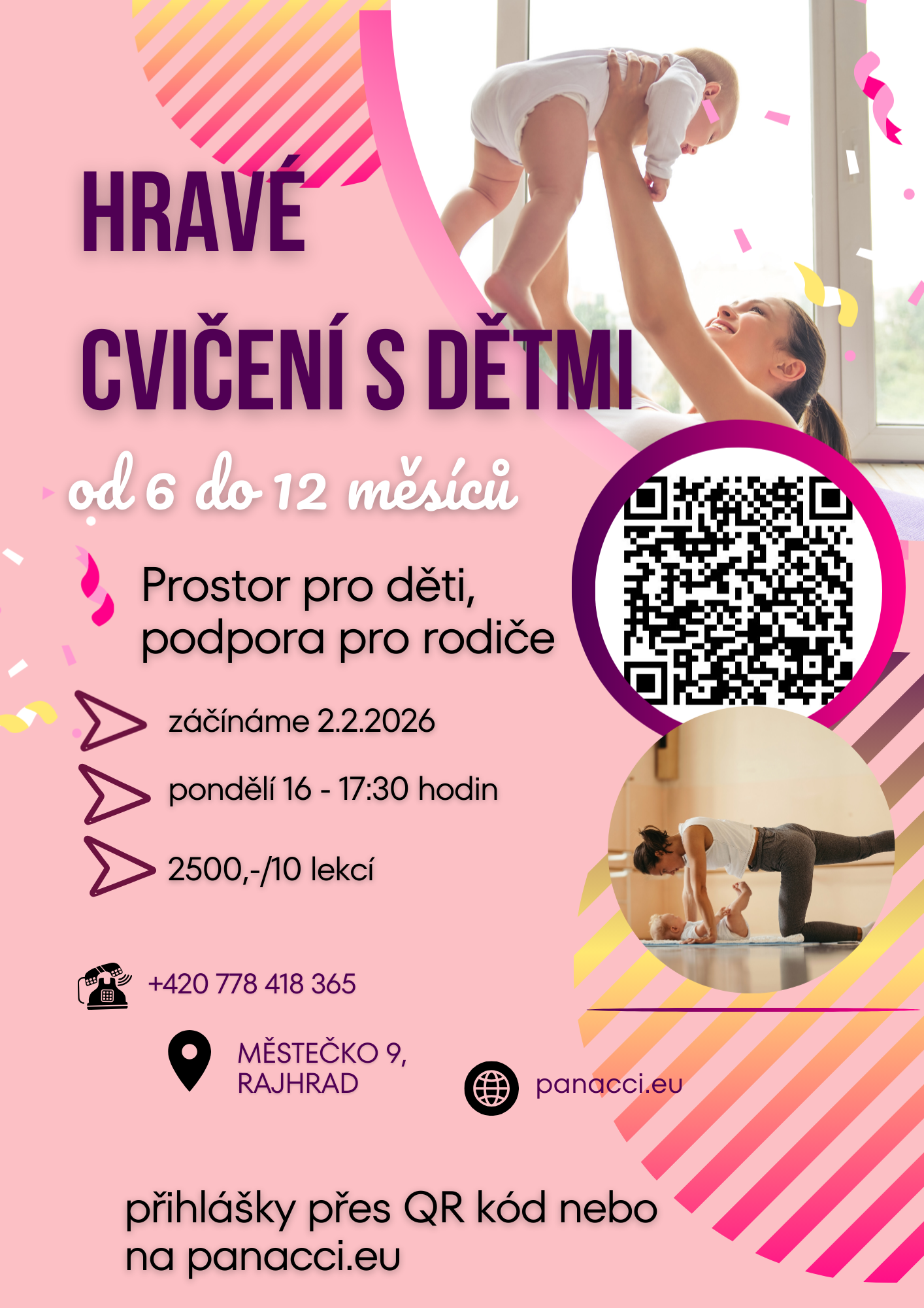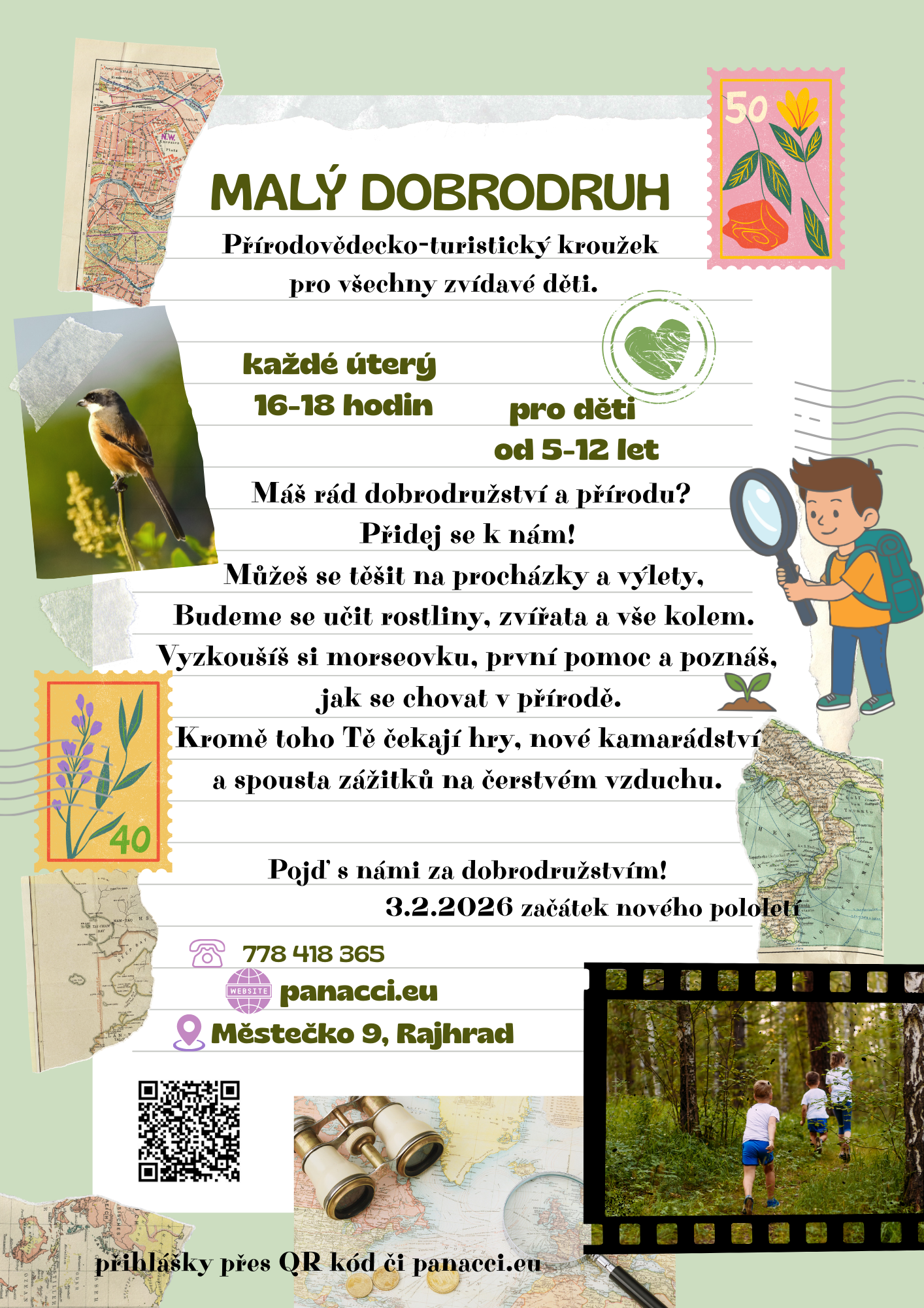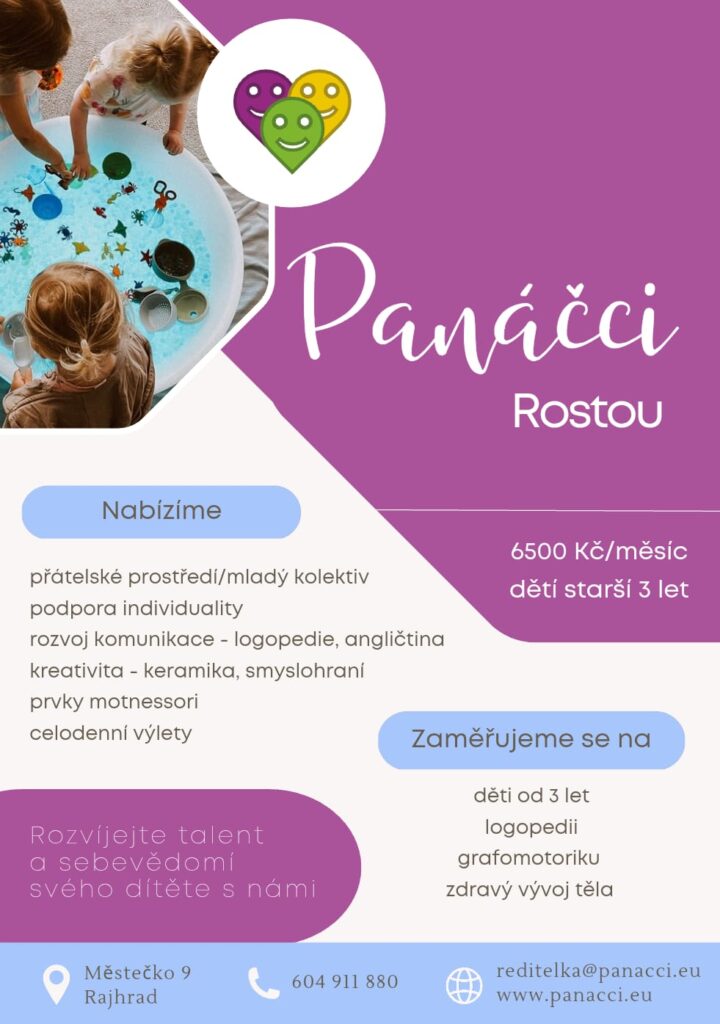 - DĚTSKÁ SKUPINA PANÁČCI RAJHRAD – přihlášky na školní rok 2026/2027, přírodovědný turistický kroužek Malý Dobrodruh, hravé cvičení s miminky