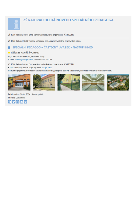 - ZŠ TGM RAJHRAD – přijme speciálního pedagoga na částečný úvazek, nástup ihned