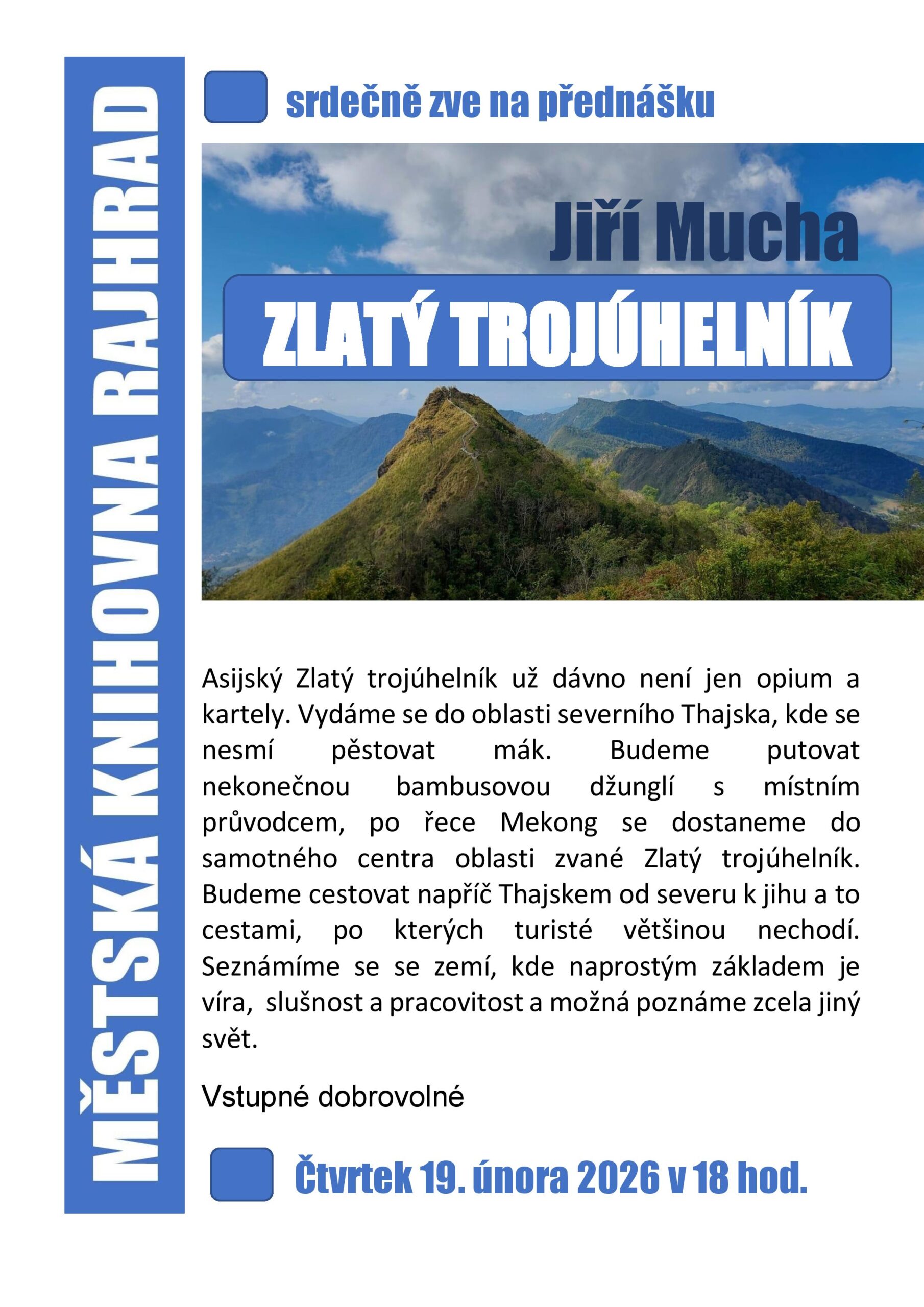 - ZLATÝ TROJÚHELNÍK – cestovatelská přednáška J. Muchy, Městská knihovna Rajhrad v 18 hod.