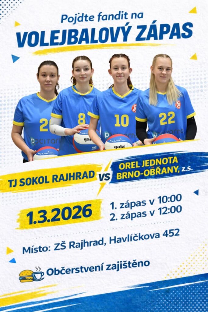 - VOLEJBAL ŽEN TJ SOKOL Rajhrad x Orel Jednota Brno-Tuřany v neděli v 10 a 12 hod. sportovní hala ZŠ Havlíčkova