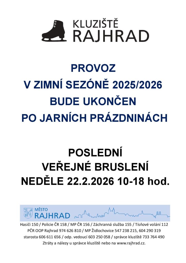 S ohledem na předpověď dlouhodobého oteplení bude provoz rajhradského městského kluziště v neděli 22.2.2026 ukončen.
