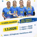 Volejbalový oddíl TJ SOKOL Rajhrad zve na ženský volejbalový zápas v neděli 1. března 2026 do sportovní haly v ZŠ Havlíčkova.