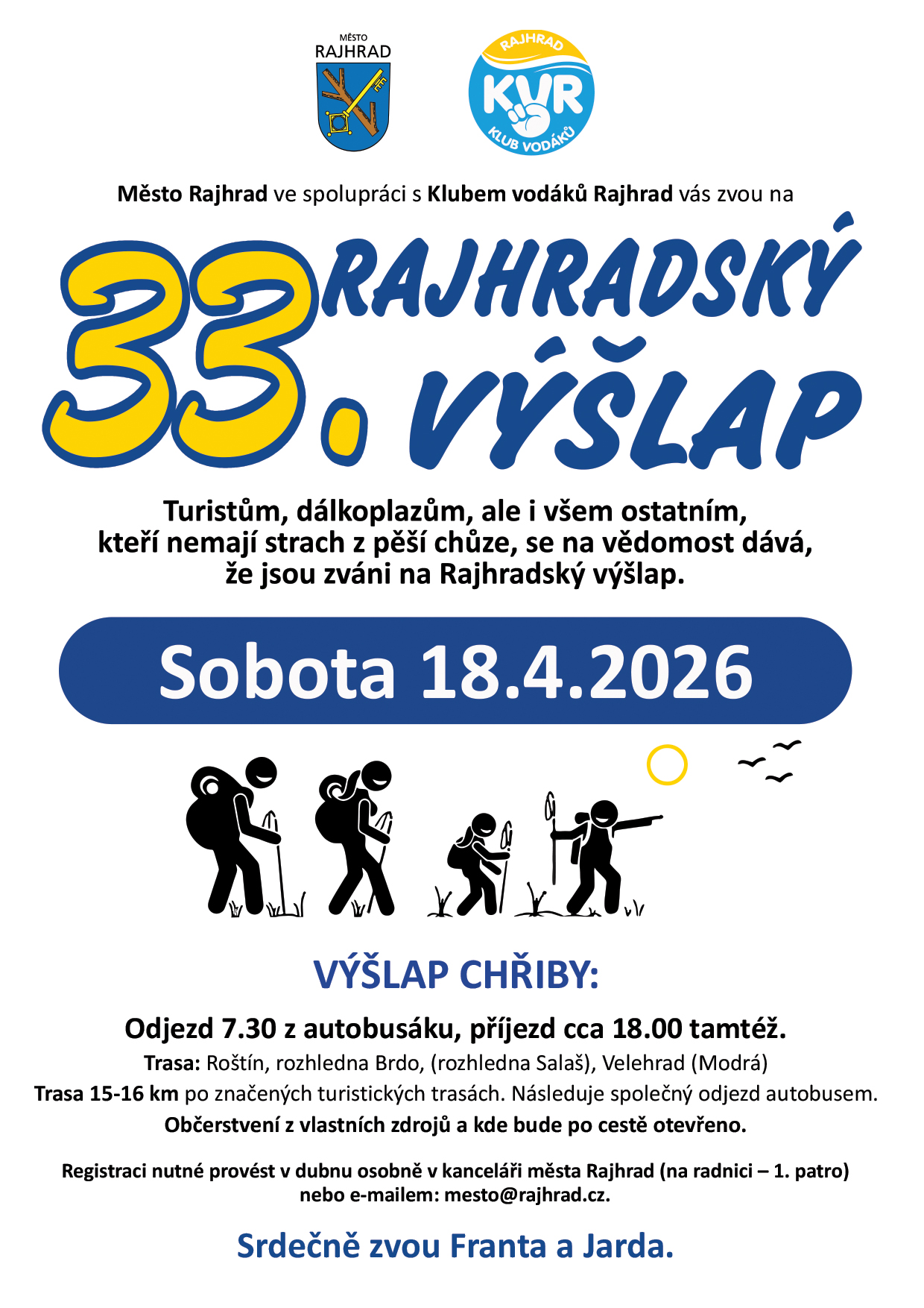 - zahájena registrace na JARNÍ RAJHRADSKÝ VÝŠLAP na chřibsko v sobotu 18. dubna, provést lze nejlépe e-mailem na město