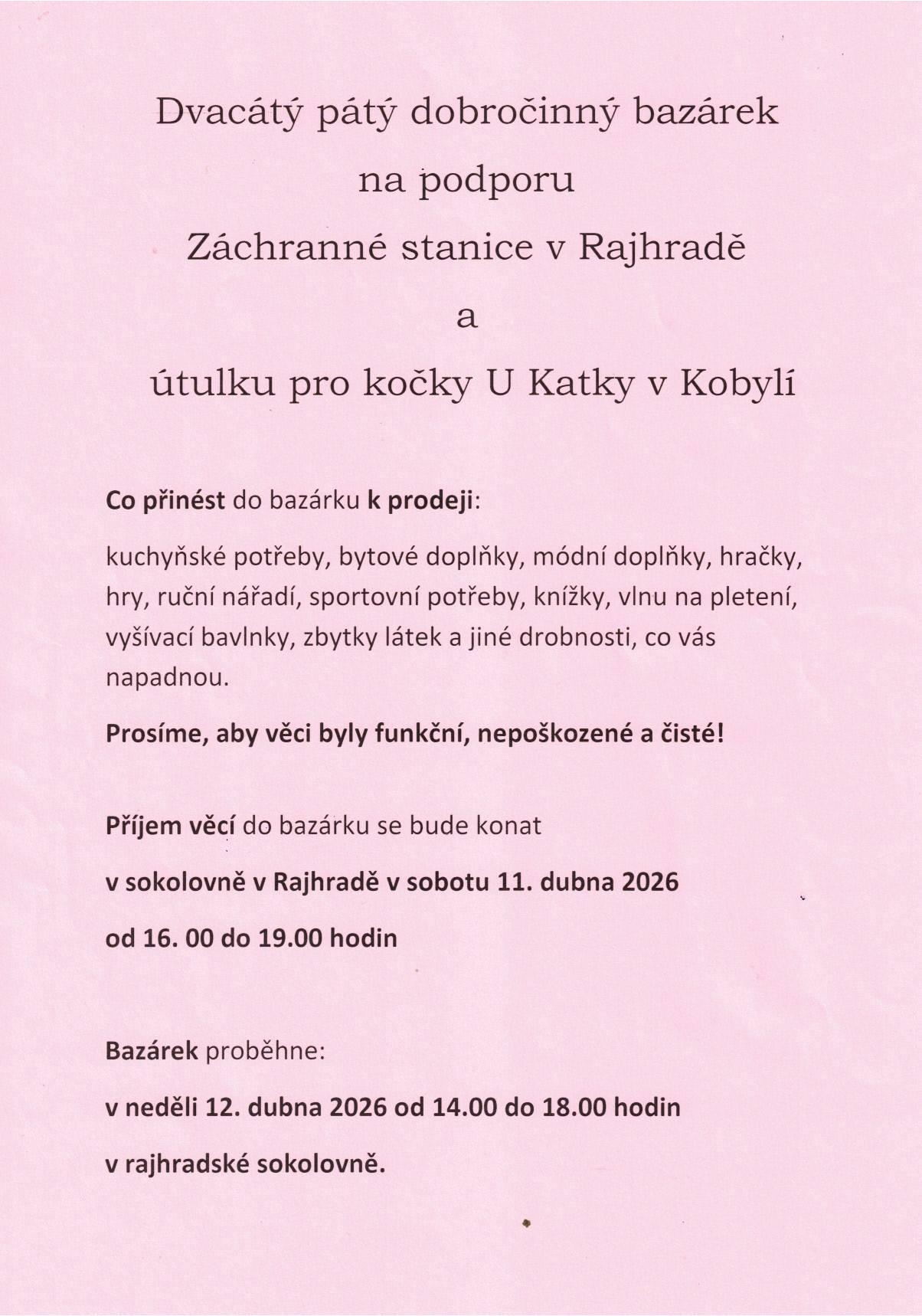 - neděle: 25. DOBROČINNÝ BAZÁREK, sokolovna PŘÍJEM nových věcí: v sobotu 16-19 hod. / PRODEJ věcí: v neděli 14-18 hod.