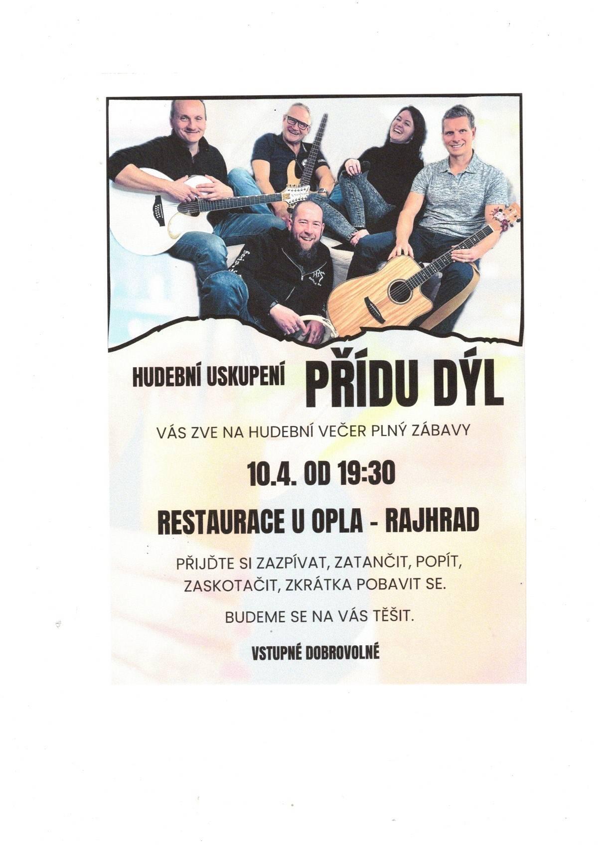 - pátek: HUDEBNÍ VEČER U OPLA, hraje Přídu dýl, od 19.30 hod.