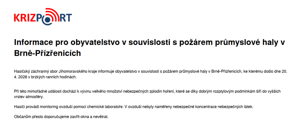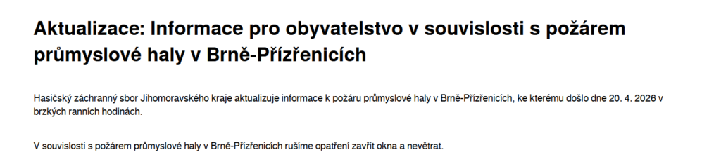Hasičský záchranný sbor Jihomoravského kraje informuje obyvatelstvo v souvislosti s požárem průmyslové haly v Brně-Přízřenicích, ke kterému došlo dne 20. 4. 2026 v brzkých ranních hodinách.