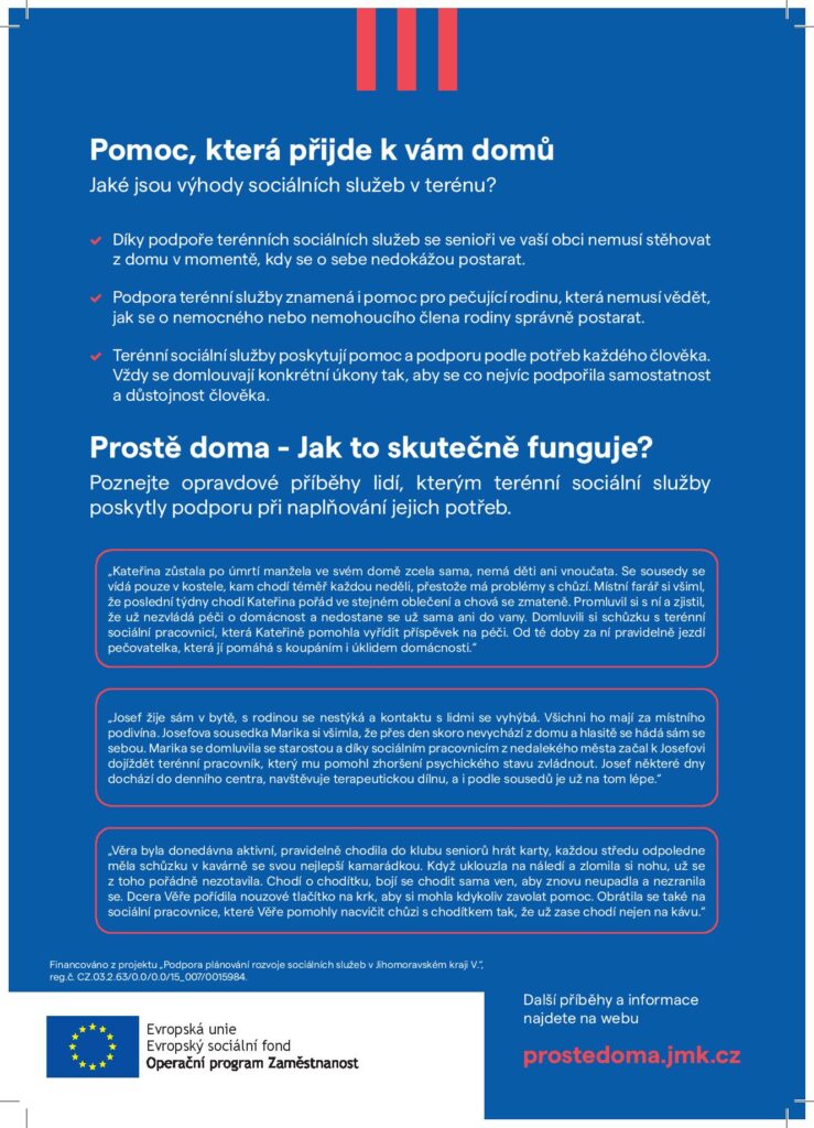 Cílem JMK je zvýšit povědomí o terénních sociálních službách a informovat, že Vaši občané mohou zůstat prostě doma, protože terénní sociální služby poskytnou Vašim občanům a jejich rodinám podporu při naplnění potřeb, které už nezvládnou zastat svépomocí. Do těchto úkonů spadají například tyto činnosti: