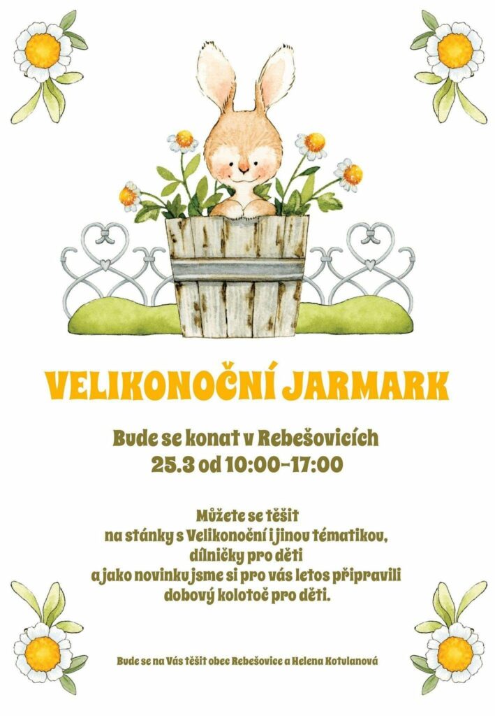 Velikonoční jarmark v Rebešovicích 25.3.2023 od 10-17 hodin. Můžete se těšit na stánky s velikonoční i jarní tématikou. Různé dílničky pro děti. Poprvé k nám na jarmark dojede dobový kolotoč pro děti. Jarmark se uskuteční za každého počasí.
