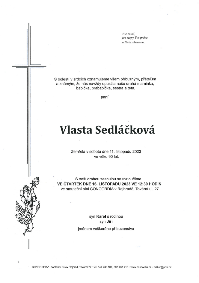 VLASTA SEDLÁČKOVÁ † 11.11.2023