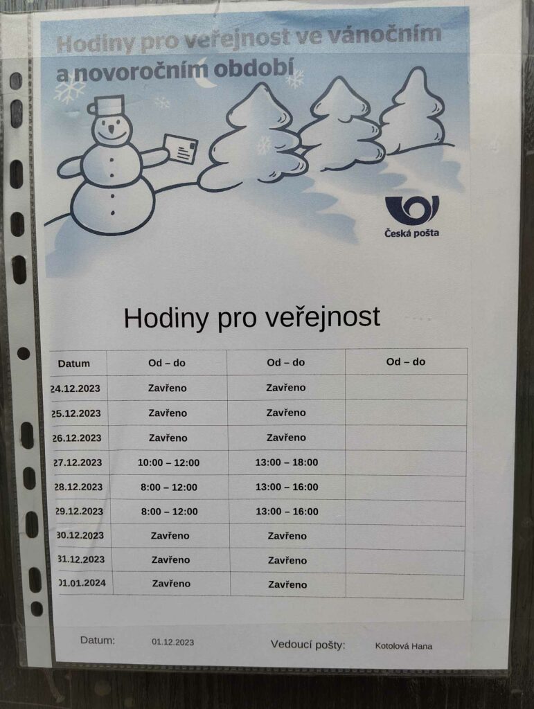 otevřeno bude pro veřejnost ve dnech: 27.-29.12.2023, ostatní dny zavřeno, běžný provoz od 2.1.2024