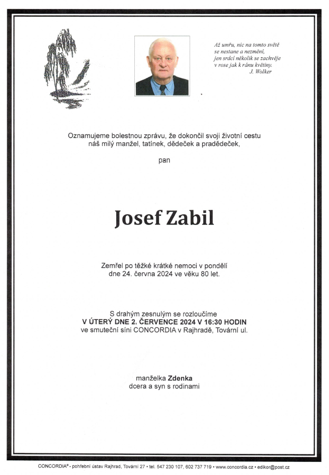 Rodina Zabilova a Veselá děkuje všem, kteří se přišli rozloučit se zesnulým panem Josefem Zabilem.