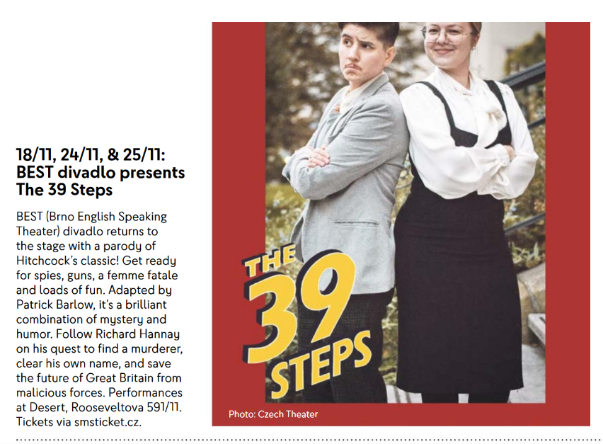 After a long hiatus, BEST divadlo aka Brno English Speaking Theater returns to the stage with an exciting parody of a Hitchcock’s spy classic The 39 Steps!