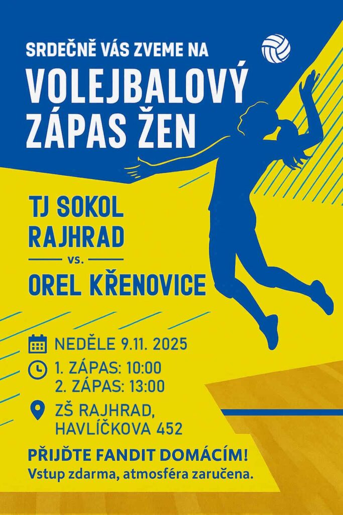 Volejbalový oddíl T.J.SOKOL Rajhrad zve na ženský volejbalový zápas v neděli 9. listopadu 2025 do sportovní haly v ZŠ Havlíčkova.