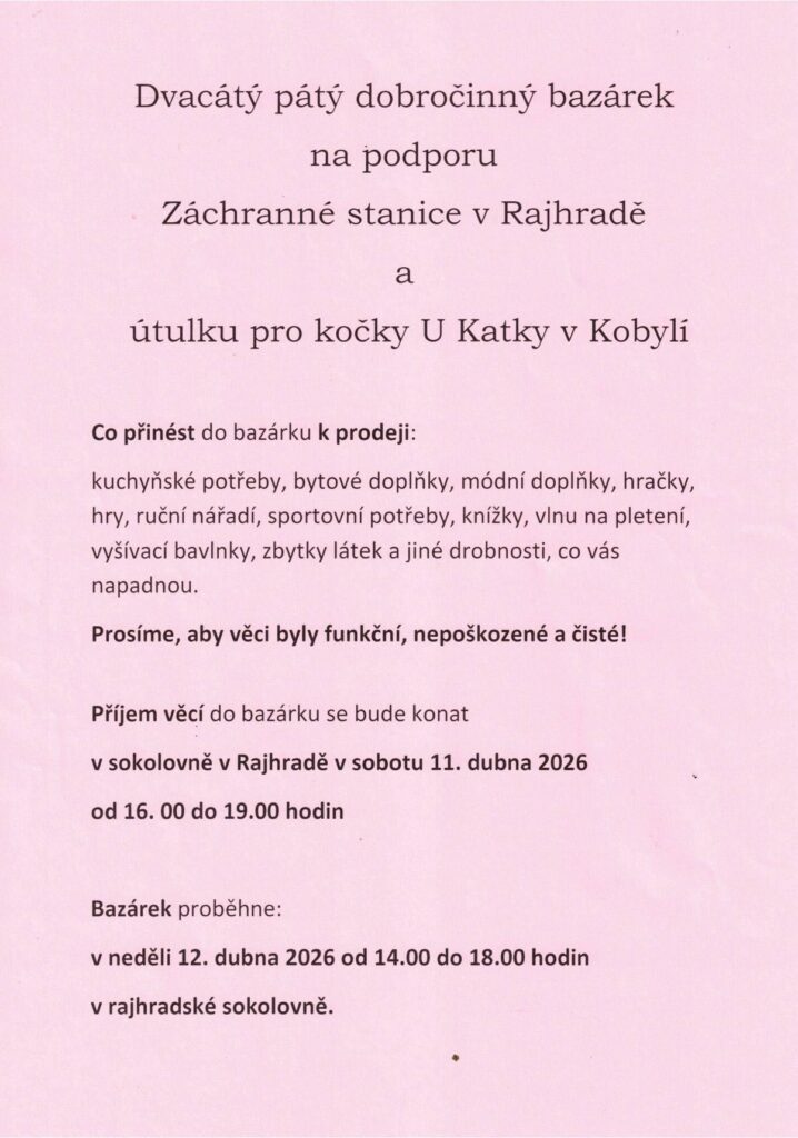 RAJHRAD / sokolovna / příjem věcí 11.4.2026 16-19 hod. * bazárek 12.4.2026 14-18 hod.