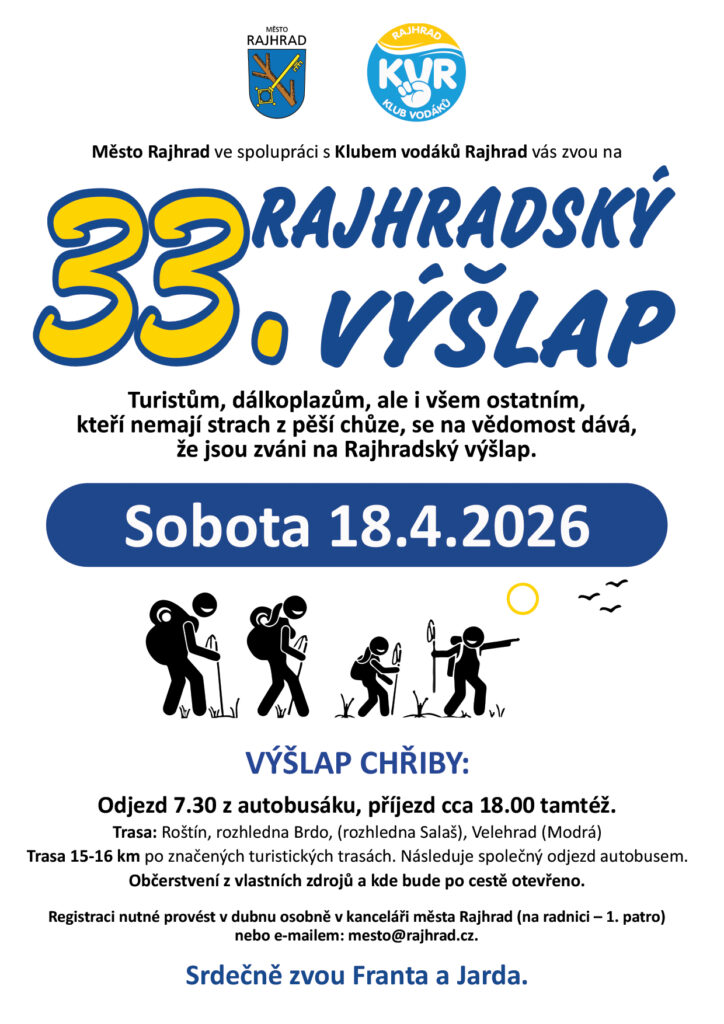 - místo v autobuse si v dubnu předem rezervujte: osobně na radnici nebo e-mailem: mesto@rajhrad.cz