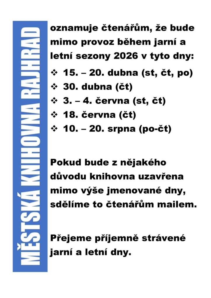 Městská knihovna Rajhrad – bude ZAVŘENO: 15.-20.4. | 30.4. | 3.-4.6. | 18.6. | 10.-20.6.2026