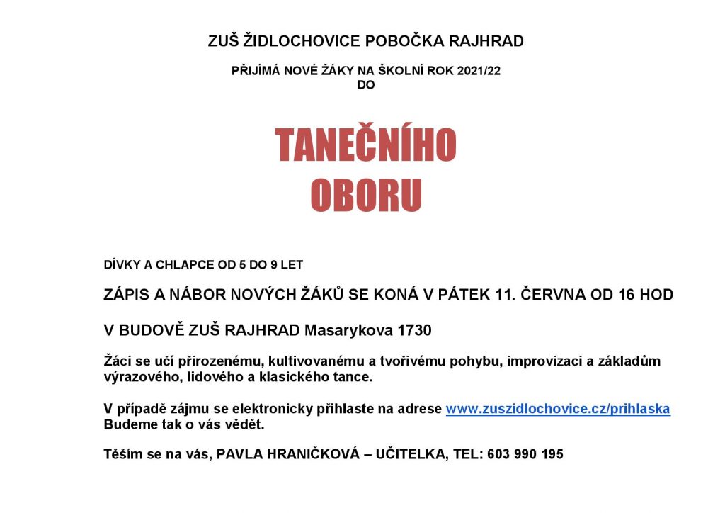 ZUŠ RAJHRAD – ZÁPIS DO TANEČNÍHO OBORU – 11.6.2021