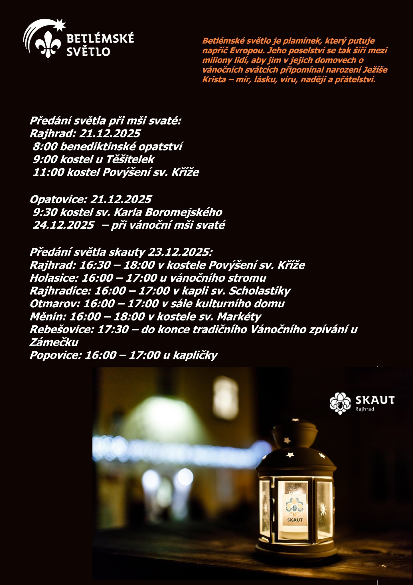 - Betlémské světlo – předávání při mších v neděli 21.12. nebo skauty v úterý 23.12. 16.30-18 hod. ve farním kostele