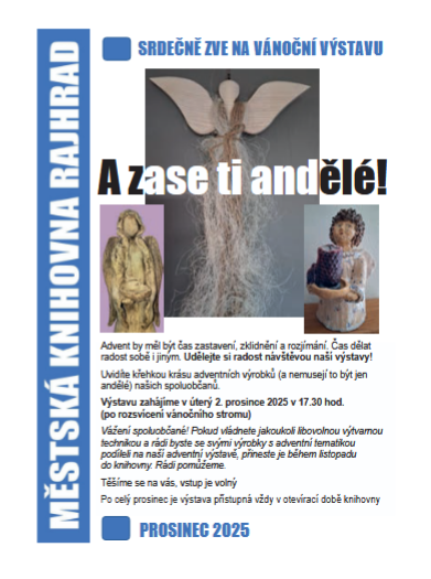 zpívají děti ze ZUŠ a MŠ, na teplé nápoje vhodný vlastní hrneček - úterý: OTEVŘENÍ VÝSTAVY „A zase ti andělé!“, knihovna, 17.30 hod.
