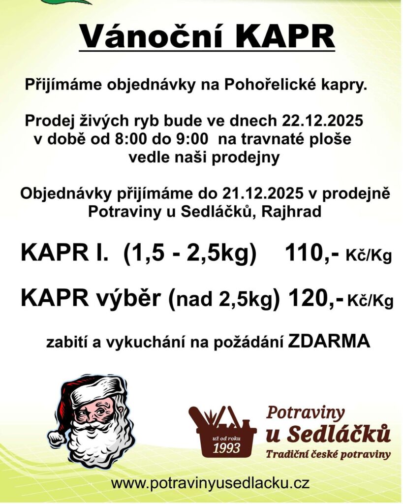 - Pohořelický kapr – Potraviny u Sedláčků – na objednávku – prodej na trávě u potravin 22.12.2025 8-9 hod.