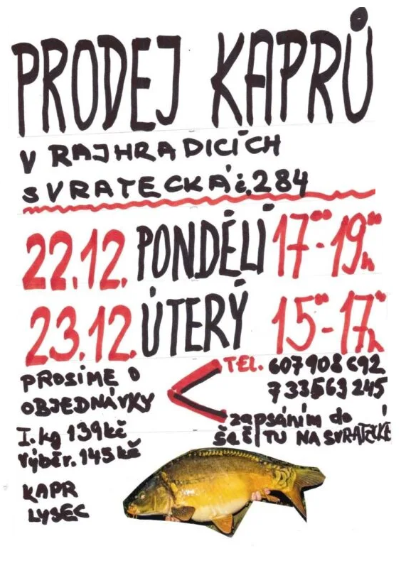 - kapr lysec z Vysočiny – Křížovi – na objednávku – k vyzvednutí v Rajhradicích 22.12. 17-19 hod. nebo 23.12. 15-17 hod.