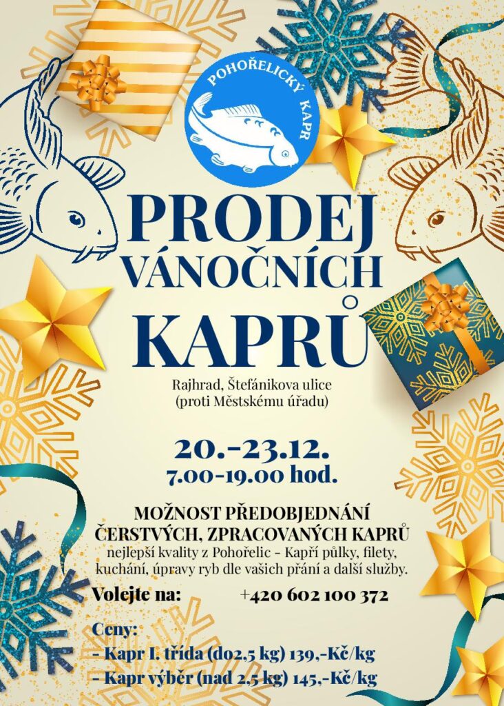 - Pohořelický kapr – prodejce p. Veselý – volný prodej u parčíku u radnice 20.-23.12. 7-19 hod.
