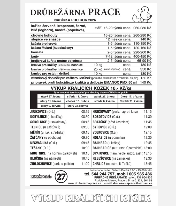 - Drůbežárna Prace, prodejní místo u kašny 12.45 hod. – prodej krmiv, vitamínů, výkup králičích kůží, 27.1.2026
