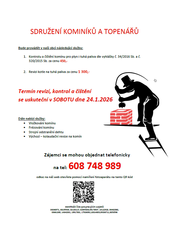 - SDRUŽENÍ TOPENÁŘŮ A KOMINÍKŮ Malá Morávka přijímá telefonické objednávky na služby, které bude provádět v Rajhradě v sobotu 24.1.2026