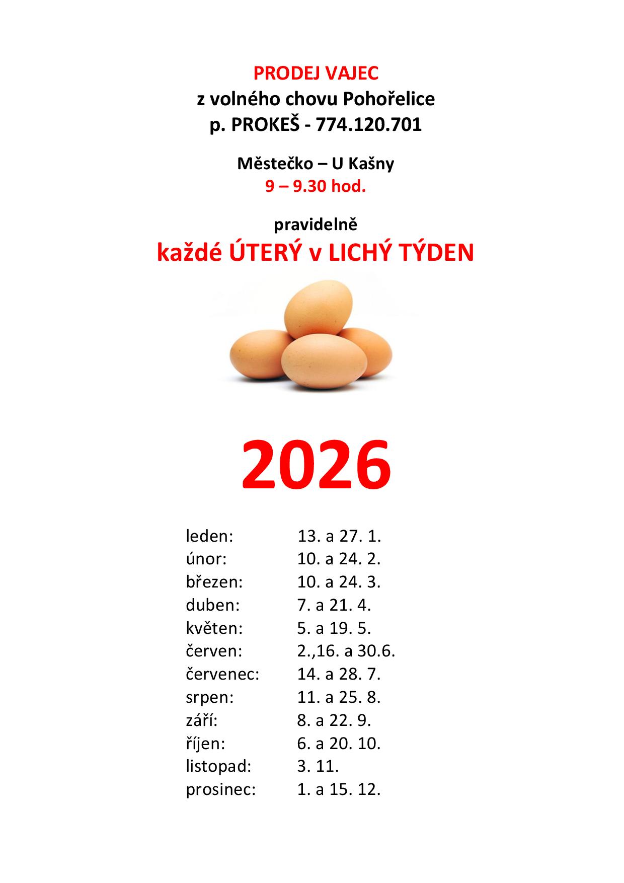 - Prodej vajec Prokeš, prodejní místo u kašny, každý lichý týden v úterý, 9-9.30 hod. – prodej vajec z Pohořelic, 27.1.2026