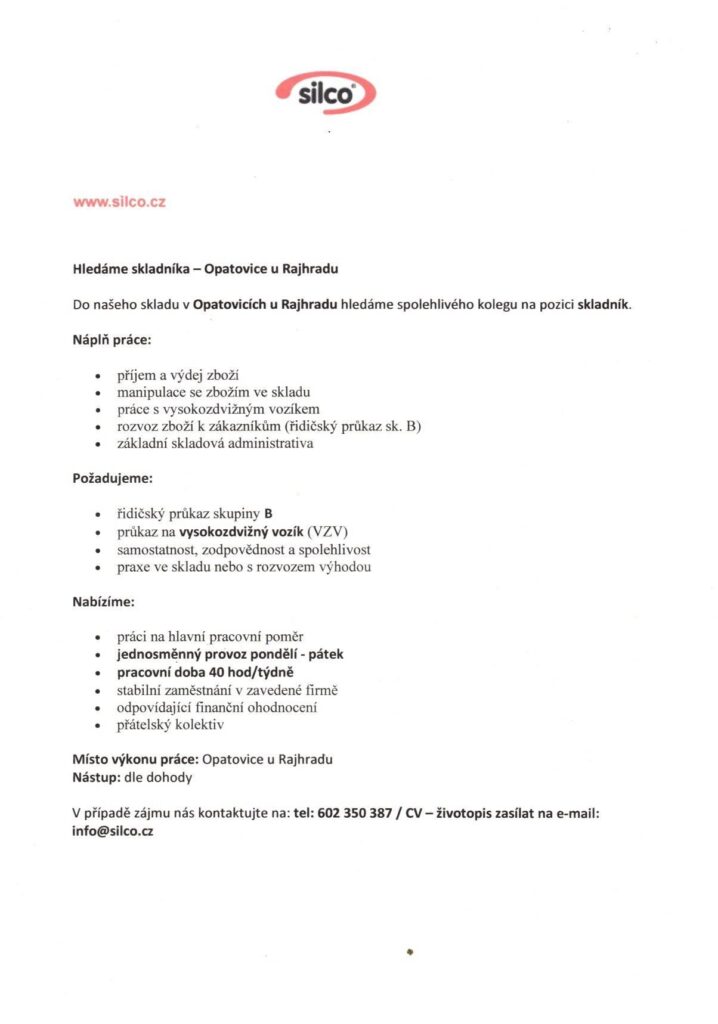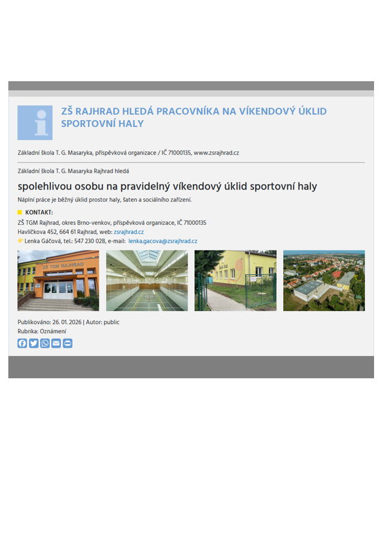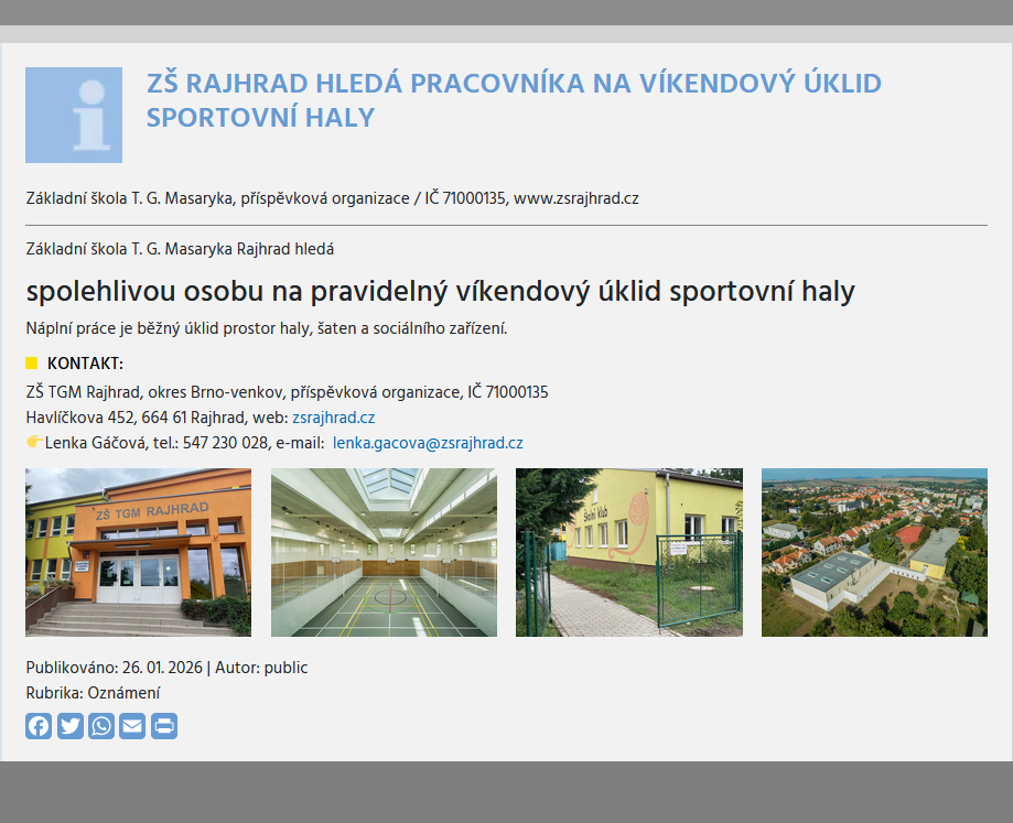 - ZŠ Rajhrad hledá spolehlivou osobu na pravidelný víkendový úklid sportovní haly