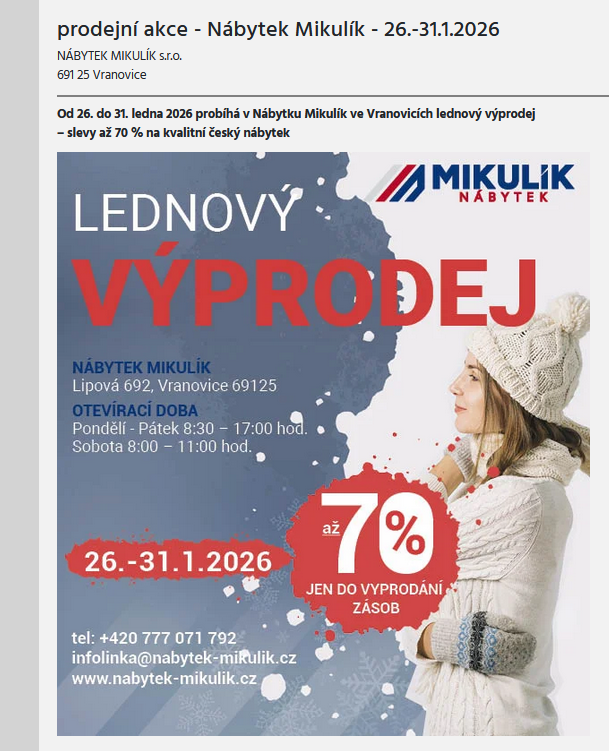 - Nábytek Mikulík Vranovice – lednový výprodej 26.-31.1.2026