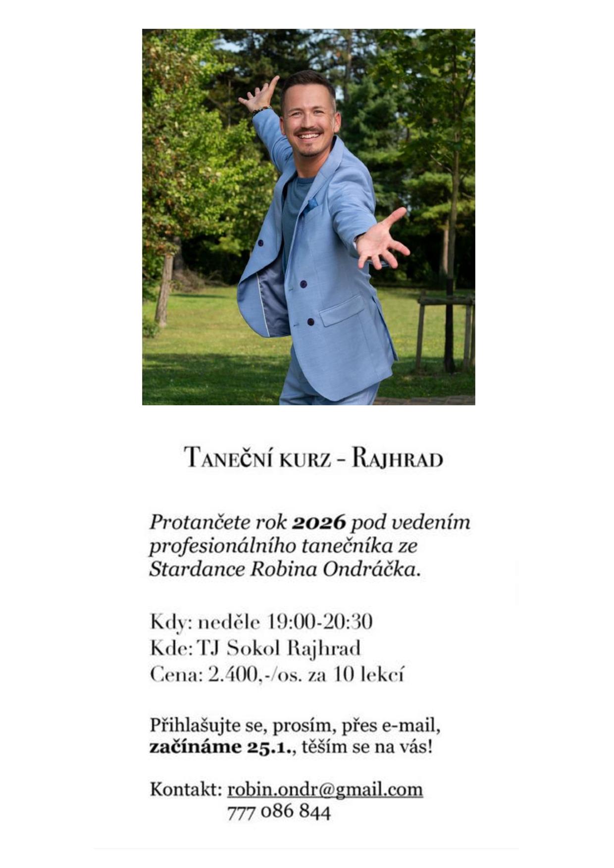 - Taneční kurz s ROBINEM Ondráčkem, 14. lekcí od 25.1.2026, přihlášky elektronicky